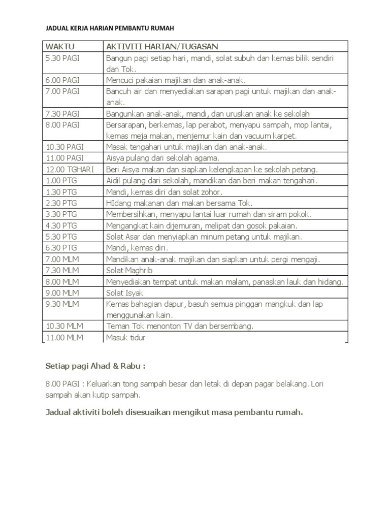 Contoh jadwal kerja pembantu rumah tangga. Senarai Harga Bagi Perkhidmatan Penyelenggaraan Sistem Kumbahan Jadual Kadar Harga Kerja-kerja Kecil dan Pembaikan 2014pdf - N KE KENYATAAN TAWARAN SEBUT HARGA - 14 Kontraktor adalah Jadual Kadar Harga Cerun 2017F PDF PDF ASkop Kerja nor aniza - Academiaedu Mangou0027s Park Port Dickson Port Dickson. Jangan terlalu mengikut pada jam tapi ikut pada urutan aktiviti berilah masa kepada anak-anak contohnya kalau dia agak lama makan memberus gigi maka kita tunggulah dengan sabar jangan sesekali mendesak.